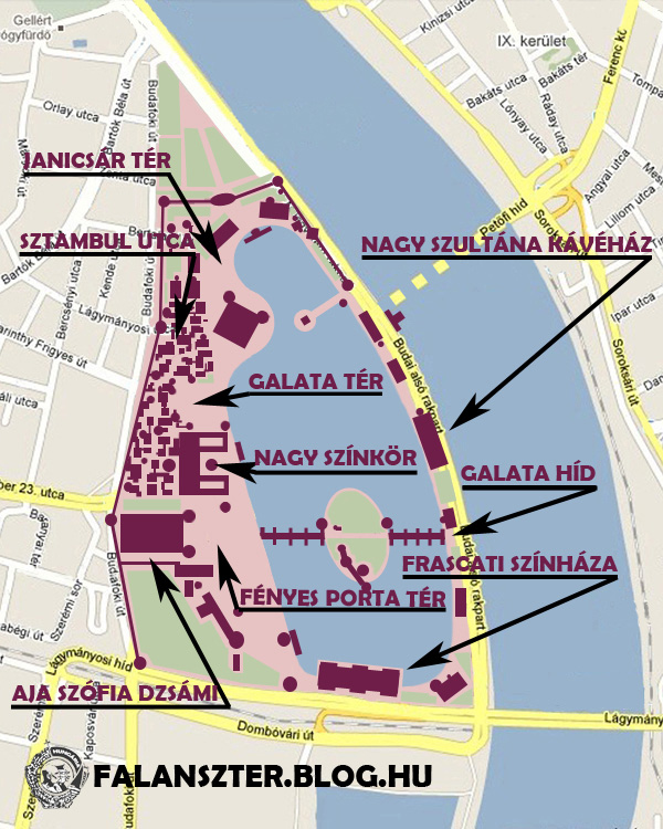 Képzeljék el a mai Duna partot a Gellért térhez közel eső Zenta utca végétől a Rákóczi hídig. Ez a hosszan elnyúló terület több helyen elérte az 540 méter szélességet is. Ez volt a szabadtéri mulató helyszíne. A Duna szabályozásával elzárt Dunaág képezte azt a tavat, amit elneveztek Boszporusznak, benne egy fűzfás, ligetes, virágos sziget adta a további inspirációt. A generáltervező Gerster Károly műépítész volt, aki egyébként számtalan feladatot látott el ebben az időszakban más helyszíneken is. Somossy legfontosabb külföldi partnere Sadulla Lévi vállalkozó volt, aki az eredeti török berendezési tárgyakról és nem utolsó sorban az igazi török hangulatról gondoskodott táncosnőkkel, zenészekkel, különféle egzotikus állatokkal. Nem volt hiány a mesés keleti, a spanyol, a török, az olasz és a magyar cigány kultúra képviselőiből sem. Ez vonzotta a külföldi és a hazai turistákat is.